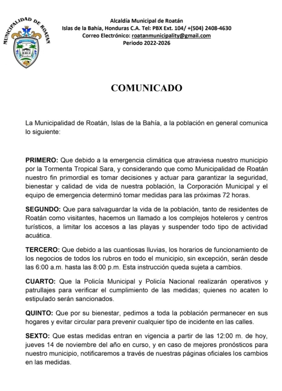 Alcaldia de Roatan emite comunicado sobre las medidas a tomar tras el paso de la Tormenta Tropical «SARA» en las que se destaca cierre de negocios de toda indole con un horario de 6:00 de la mañana hasta las 8:00 de la noche hasta nuevo aviso.