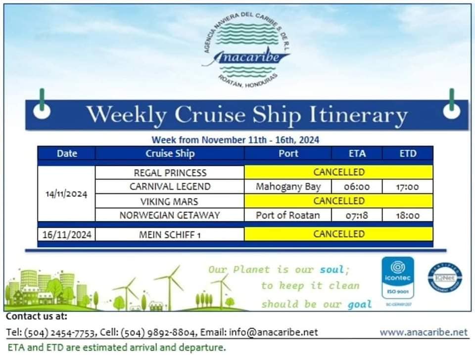Por la amenaza de la Depresion Tropical «SARA» y el estatus de alerta amarilla se suspende la llegada de buques de crucero a Roatan.