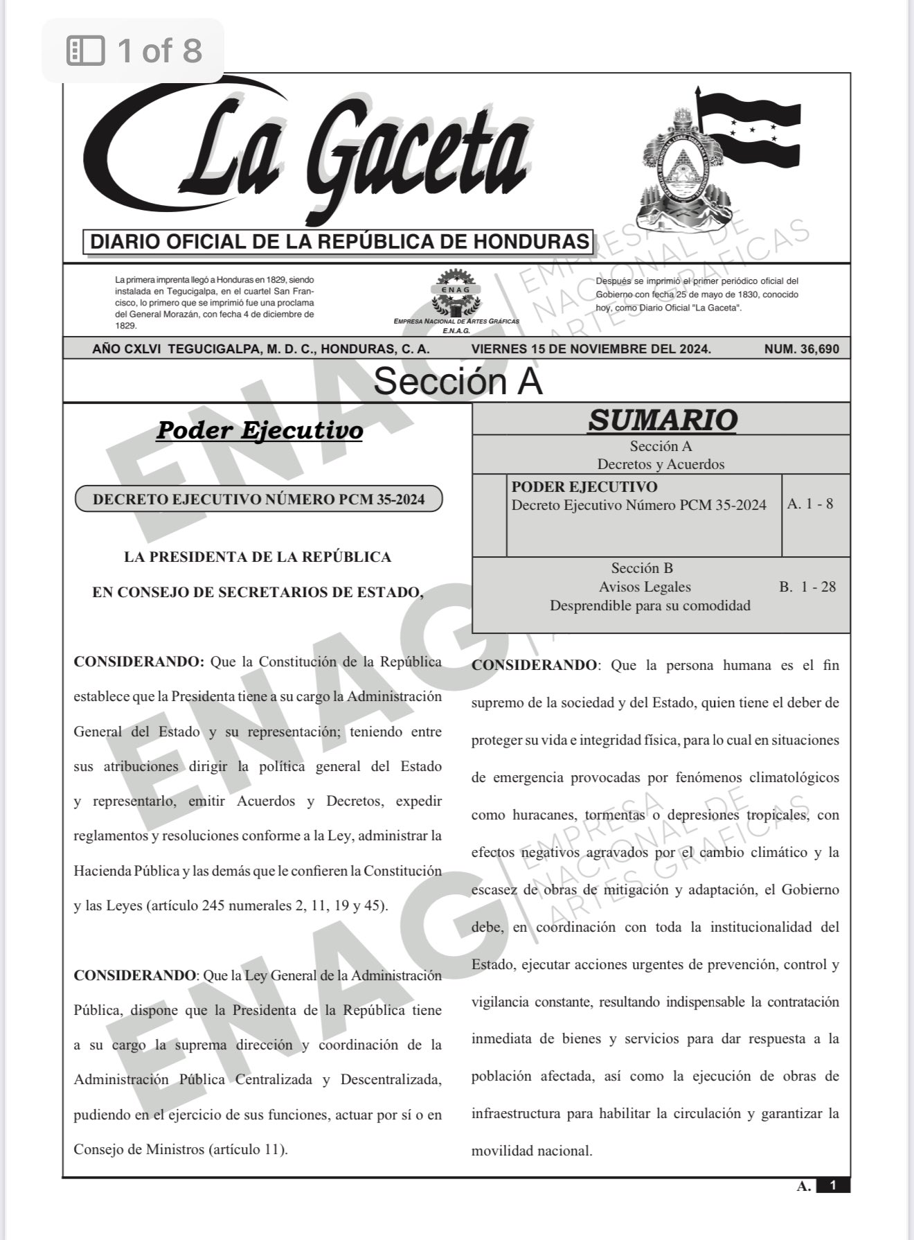 El estado de emergencia, que autoriza a hacer compras directas, ya fue publicada en la edición de La Gaceta del 15 de noviembre de 2024.
